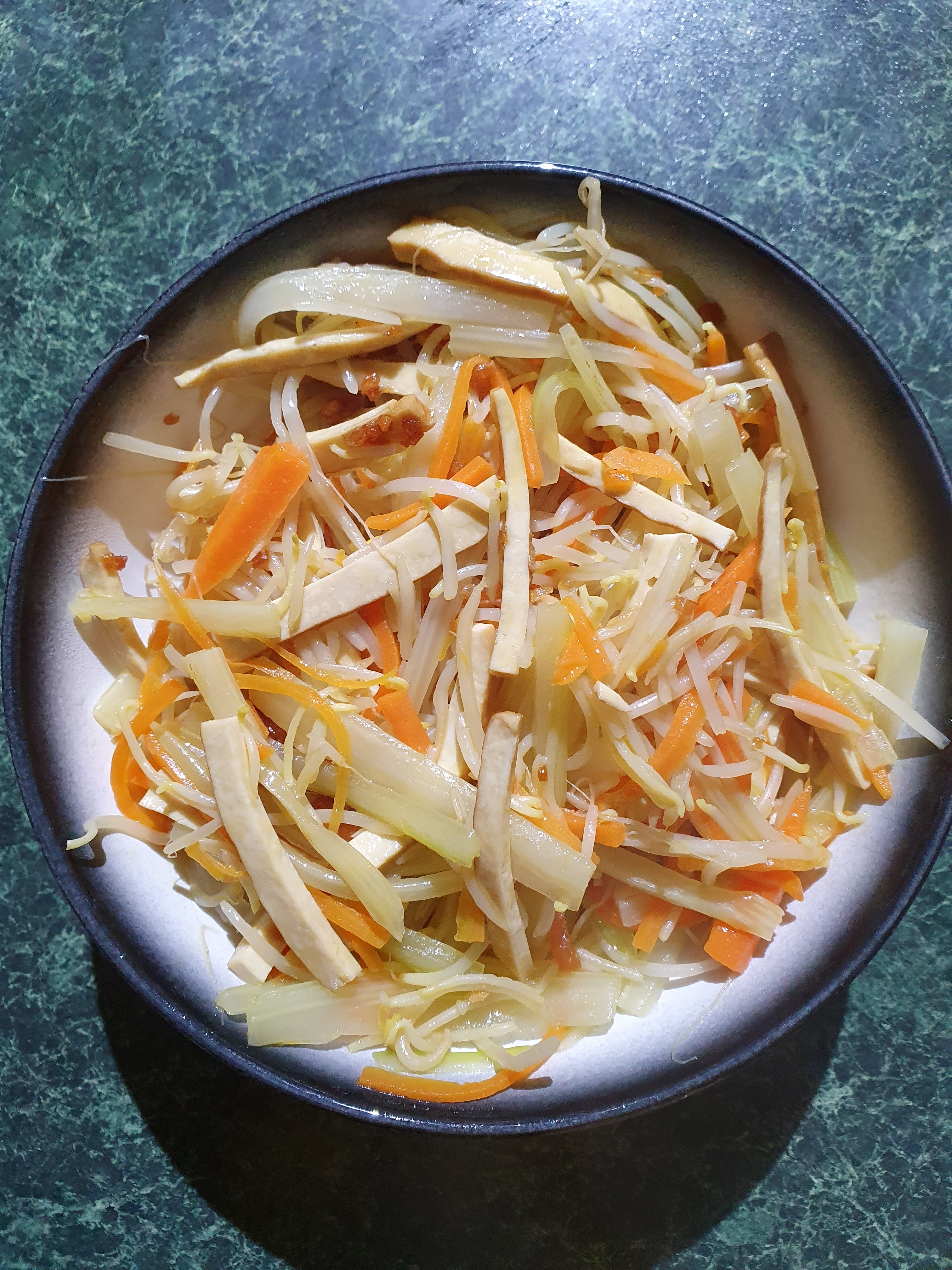 大豆芽摘了豆剩下的銀芽炒西芹絲、五香豆干絲及紅蘿蔔絲, 少許鹽調味, 炒好放一湯匙炸蒜粒入去拌勻。 便宜食材, 老伴說這醸豆卜可以請客。但Sydney lockdown, 請客無期。