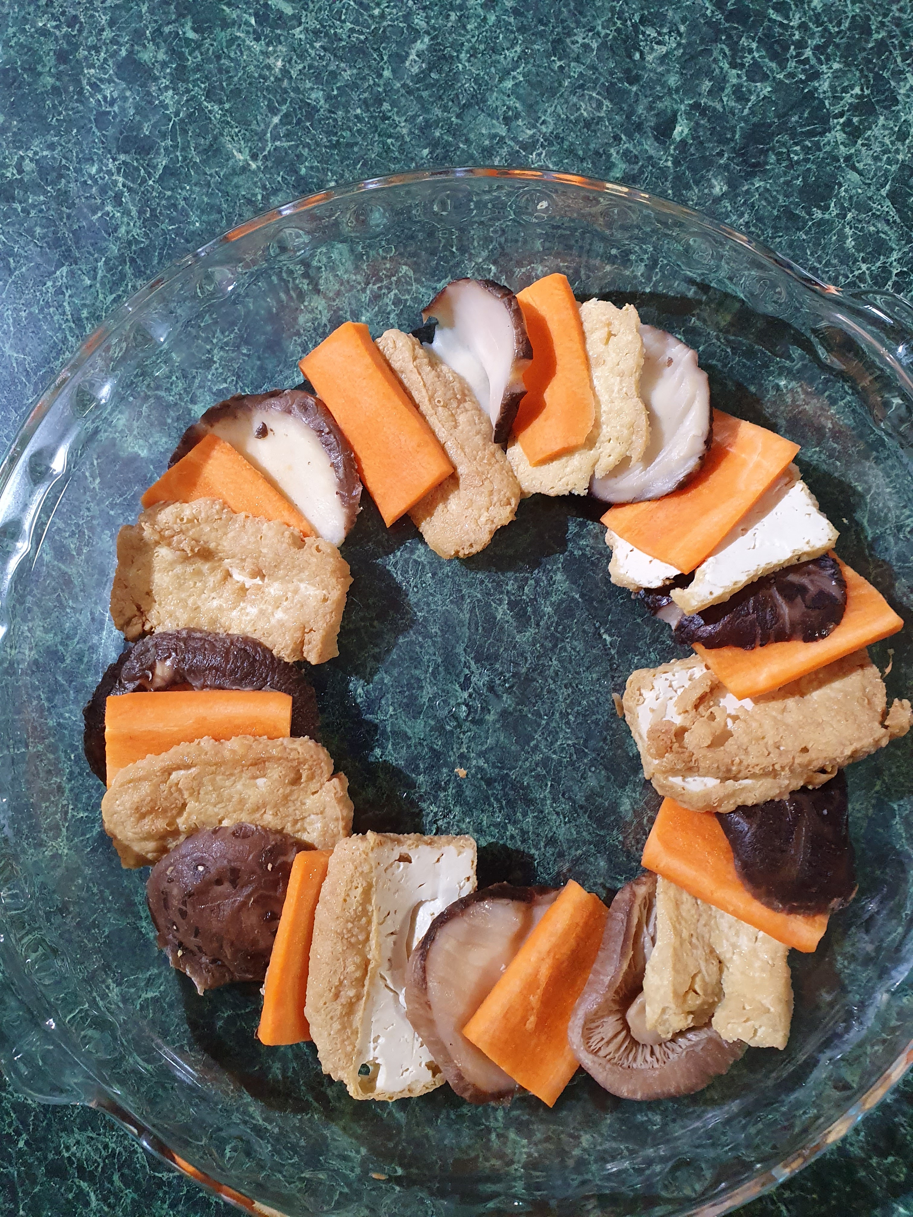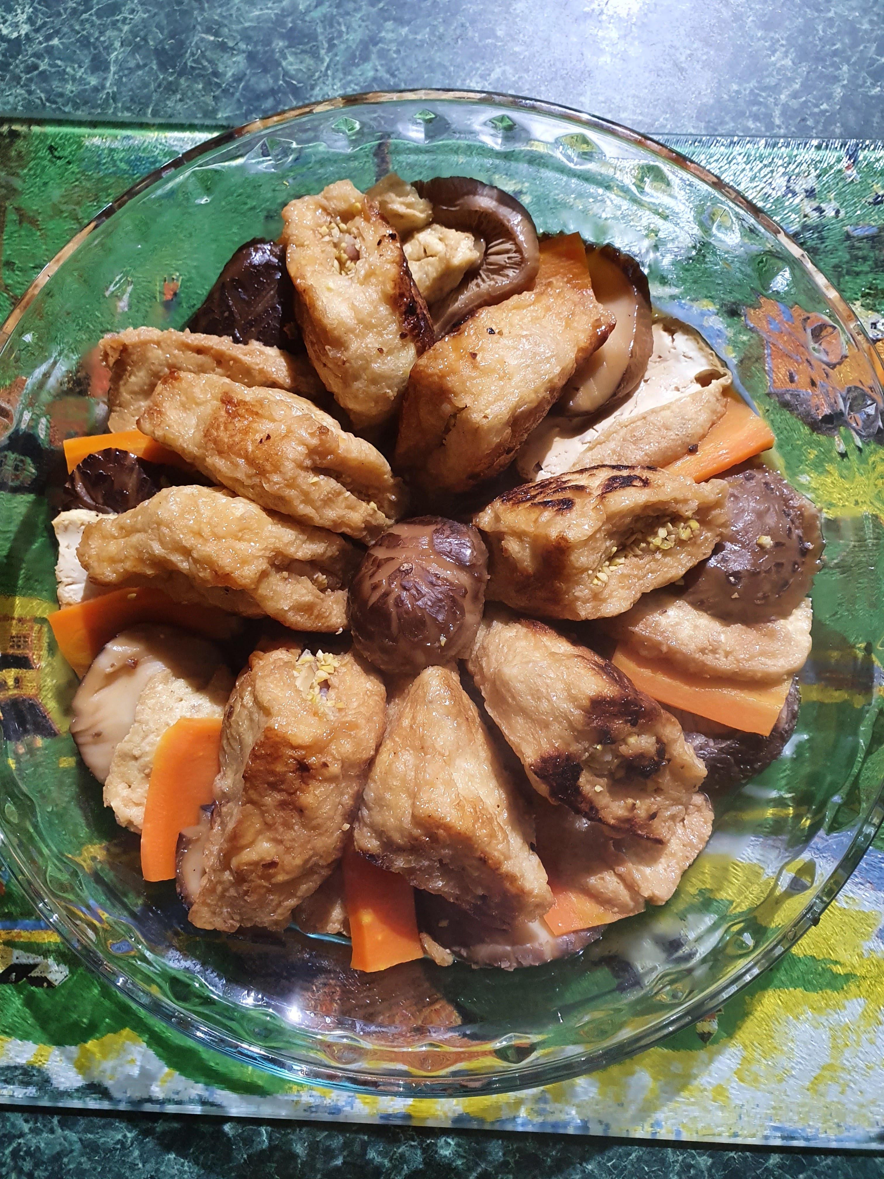 切冬菰粒、豆乾粒、紅蘿蔔粒及芋頭粒跟大豆碎一起炒, 然後釀入豆卜裏。釀好後稍煎一下豆卜, 炸豆乾、紅蘿蔔及冬菰切片伴碟, 如下圖: