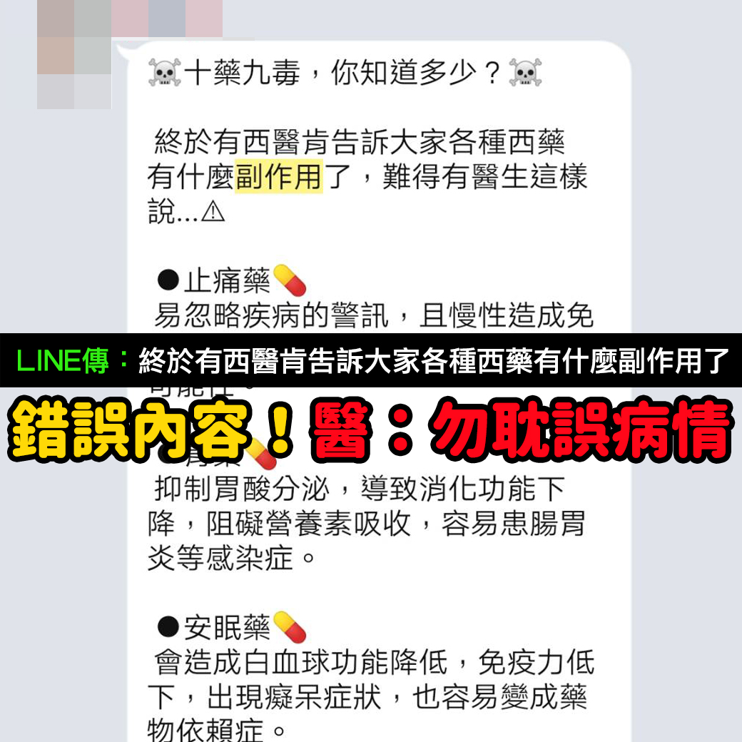 【假LINE】各種西藥有什麼副作用?終於有西醫告訴大家?謠言訊息說明: