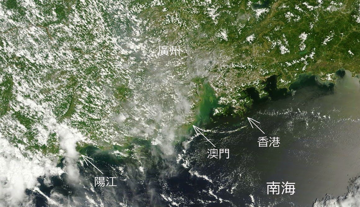從人造衛星下望見到的廣東省和毗鄰的南海,今天香港及廣東東部地區在海洋空氣覆蓋下,視野良好,景物清晰可見,不過只是一河之隔,澳門至廣州的珠三角地區,卻被一重輕紗罩住,看不清地面的情況,大概與人類活動有關的大量污染物造成能見度降低有關,影響的地區十分廣泛。