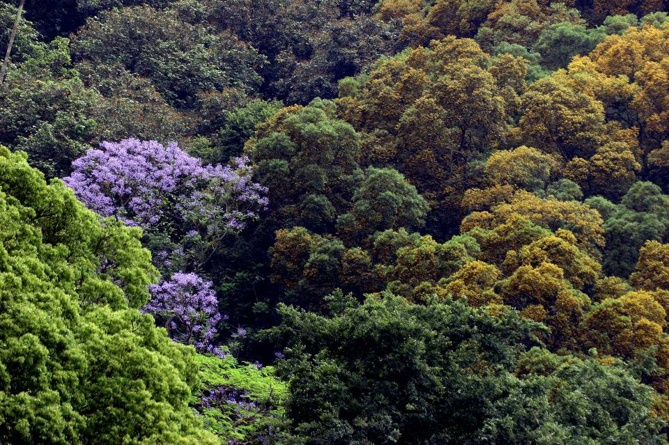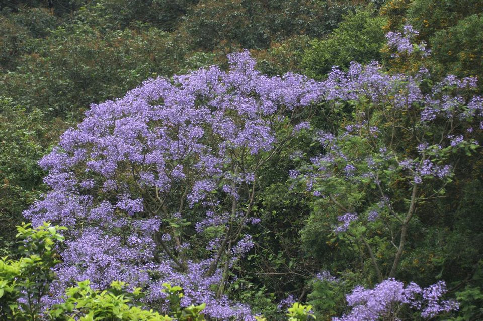 嘉道理農場:右方是開黃色花的台灣相思,左方是藍花楹