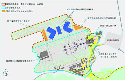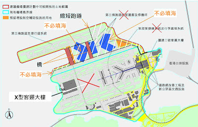 上面說過,現有機場中央早已預留大片空地,原計劃是在客運人數增加到預定水平時,興建一座規模頗大的X形客運大樓,現在正是時候執行這個計劃,增加飛機泊位和處理客流的容量,實在沒有需要在新舊跑道之間興建新的泊位和客運大樓,填海面積可以大為減少。另外到時載客鐵路可以從X形客運大樓左轉伸延到接近第三條跑道的客運大樓(如果有需要的話,其實沒有需要),省去右面橙色一塊的填海地。最後,由於在香港填海要付出太大代價,既然此刻沒有指定用途(除非服務私人飛機是特別優先項目),左面的「預留增設航空輔助設施用地」不應在本項目之內,可進一步減少填海面積。