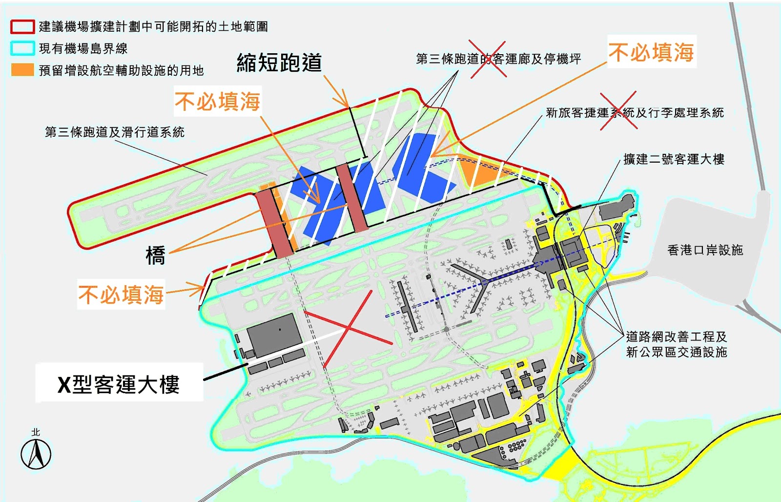 下圖展示吸納以上說法的機場構想圖,紅色是X形客運大樓,棕色是橋,白色斜線部份是不必填海的地方。