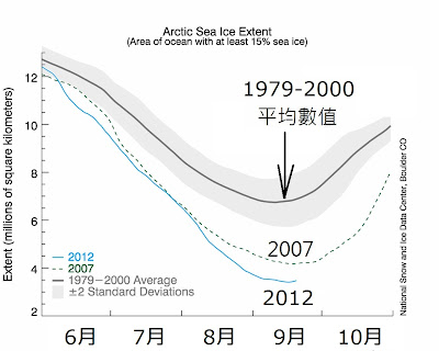 下圖顯示北冰洋夏季海冰面積變化的情況,由左至右是六月至十月,高處的黑線是19792000年的平均海冰面積數據(可以粗略理解為1990年左右的數據),虛線是2007年的數據,藍色線是今年的數據,海冰面積減少的快速顯而易見,由19902012已經跌了一半,就算變化沒有加速,北冰洋夏季海冰大概再過二十多年便會跌到零!更何況下跌的速率在增加中。
