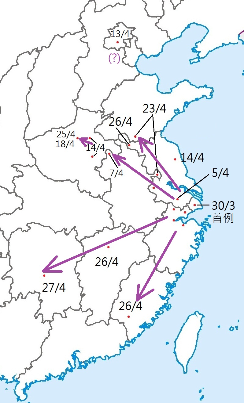 H7N9確診病例往西北方向的散播,從時間序列看,似乎分兩路,一路穿過安徵往鄭州方向,一路大致在江蘇省境內往徐州及山東枣庄方向,擴散速度比較緩慢,大概都花上十多天。春天候鳥的遷徙,大致往北飛,而且速度很快,與觀察所見的傳播方向和速度都不吻合。