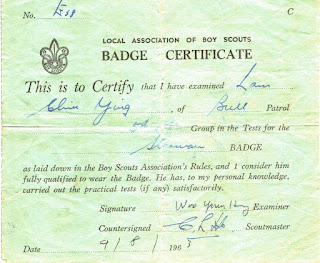 我認識大鄔,源於我中學時參加童軍,19638月我報考「觀星者」專章,考官正是鄔先生,首次接觸覺得他很平易近人,沒有因為是考官而咄咄逼人,他讓我這個童軍新仔在壓力較低的氣氛下完成考試。那時我自學天文和觀星不久,對學科的掌握不算扎實,但是他很寬容,給我合格,他簽署的專章證書我保留到今天(見下),順便一提,在證書上副署的是英皇書院老師何子樑先生,時任第五旅旅長。