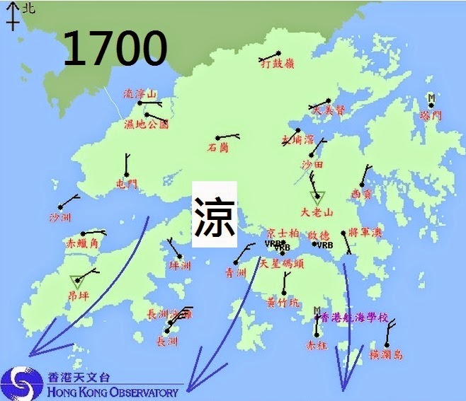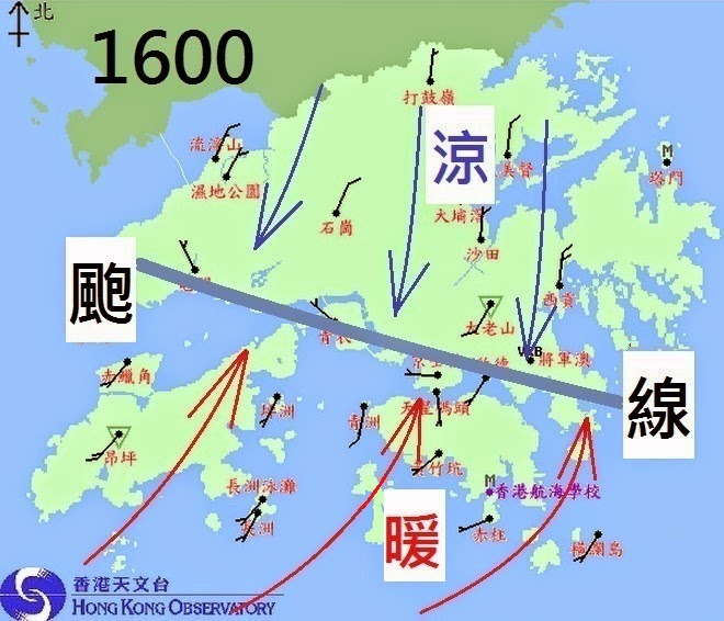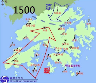 讓我們看看昨天下午三時、四時和五時的風向、風速分佈圖(底圖來源:香港天文台)。下午三時香港境內主要吹南風,不過北風開始在新界北部出現,此後南北風的分界線漸趨明顯和向南推進,四時北風即將進入維多利亞港,五時北風已經越過大嶼山、長洲和香港島,而且風力增強。