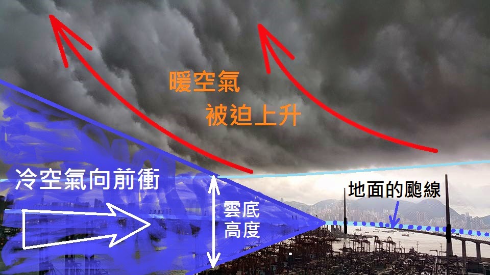 以下借用另外一張不同角度望向昂船洲的網上照片,以立體圖的方式展示颮線前後的氣流,希望有助大家理解照片中詭異低雲的形態。