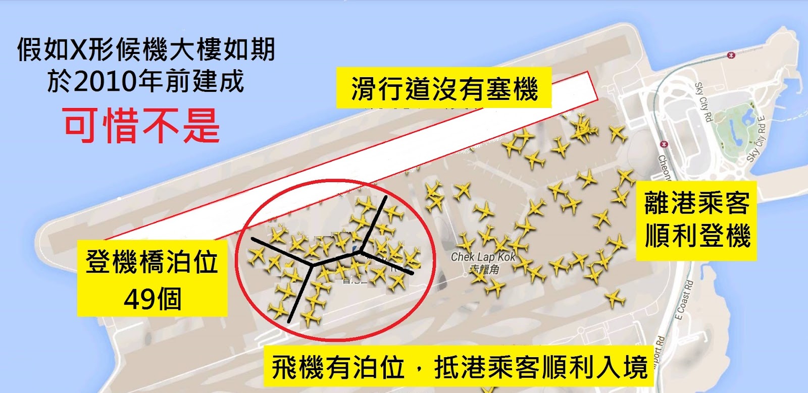 假如設計機場時早已預計要建的中場X形候機大樓如期於2010年前建成,提供49個有登機橋的飛機泊位,滑行道上的38架飛機可以立即靠泊X形候機大樓,乘客不用等四、五小時,飛機也能夠依時離港,候機大樓內便不會出現紛爭和混亂,遺憾的是這座大樓至今不知所踪。