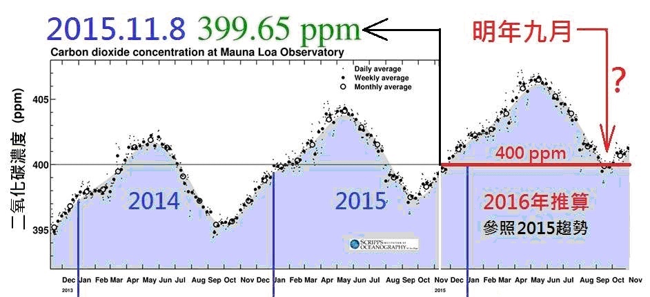 十月,夏威夷Mauna Loa觀象台(註1)的平均二氧化碳濃度是398.29 ppm,進入十一月後季節性回升,11月8日至14日的一星期平均讀數是 400.43 ppm.,超過了400 ppm 心理關口。