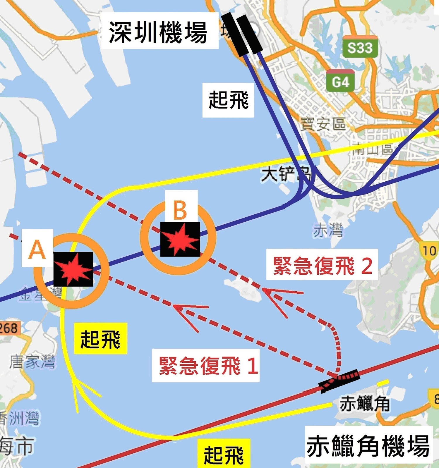 還有比較少人知道的情況,如果飛機降落時出現事故需要加油重新起飛(術語稱為「復飛」),也有指定的復飛航道,圖中劃了從東西兩方降落赤鱲角機場第三條跑道的復飛航道(註2),它們分別在A和B兩處與深圳航道重疊,雙方飛機上下差距同樣低於上述安全標準,也有撞機危險。
