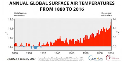 歐盟的 Copernicus Climate Change Service 剛發表了以上消息(註1),指2016的全球平均氣溫是14.8度,比18世紀中葉工業革命前高出1.3度。