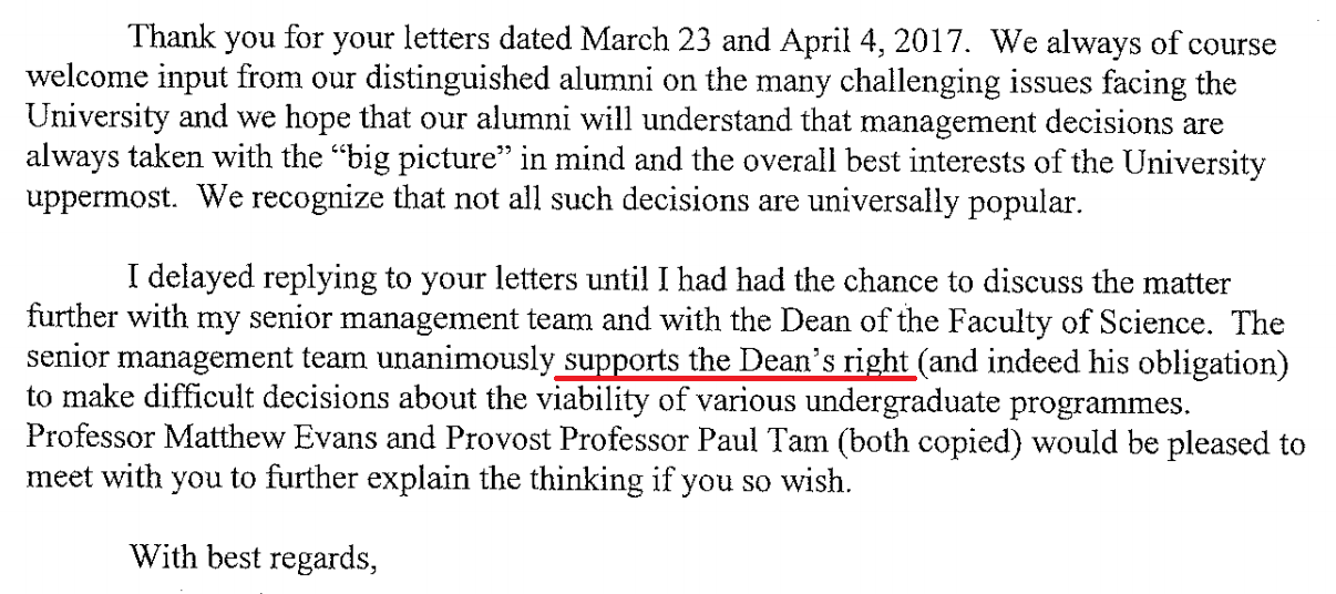 I continue to hope that the University has the wisdom to appreciate its responsibility to Hong Kong in terms of science education especially at this juncture in the city’s development. It should not let myopic views like “saving a few dollars today” overshadow its fundamental, long-term education responsibility and obligation. Senior management may choose to support the Dean’s right to make decisions, but it must not agree with the substance of those decisions where it damages university and community interests. I still request that you review the substance of the “decision” to delete the two Majors.
