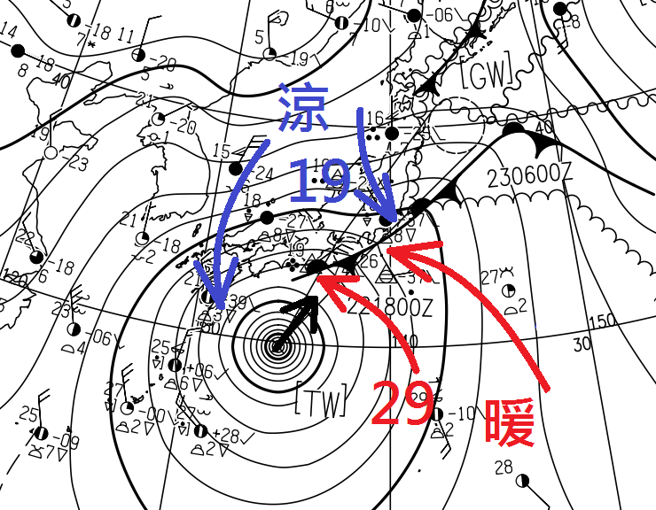 不過日本氣象廳依然發出了暴雨的警報,因為在本洲東部即東京附近,涼的冬季風與來自南方的暖空氣爭持不下,形成幾乎不動的鋒面,造成陰雨天氣背景。颱風靠近後,一方面颱風環流本身帶來大雨,另方面南風增強將帶來大量暖空氣,強化鋒面的降雨機制,兩個因素的疊加產生促成暴雨發生的協同效應,這是日本氣象廳預測有暴雨的基礎,情況跟不久前台灣在南海有颱風時東岸下了暴雨(註1)基本上一樣。
