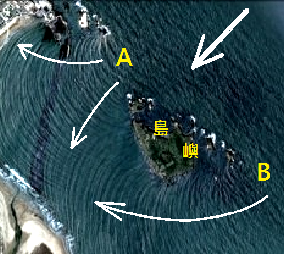 通過位置B的波浪,有本事繞到島嶼的後面,甚至與缺口A過來的波浪匯合。
