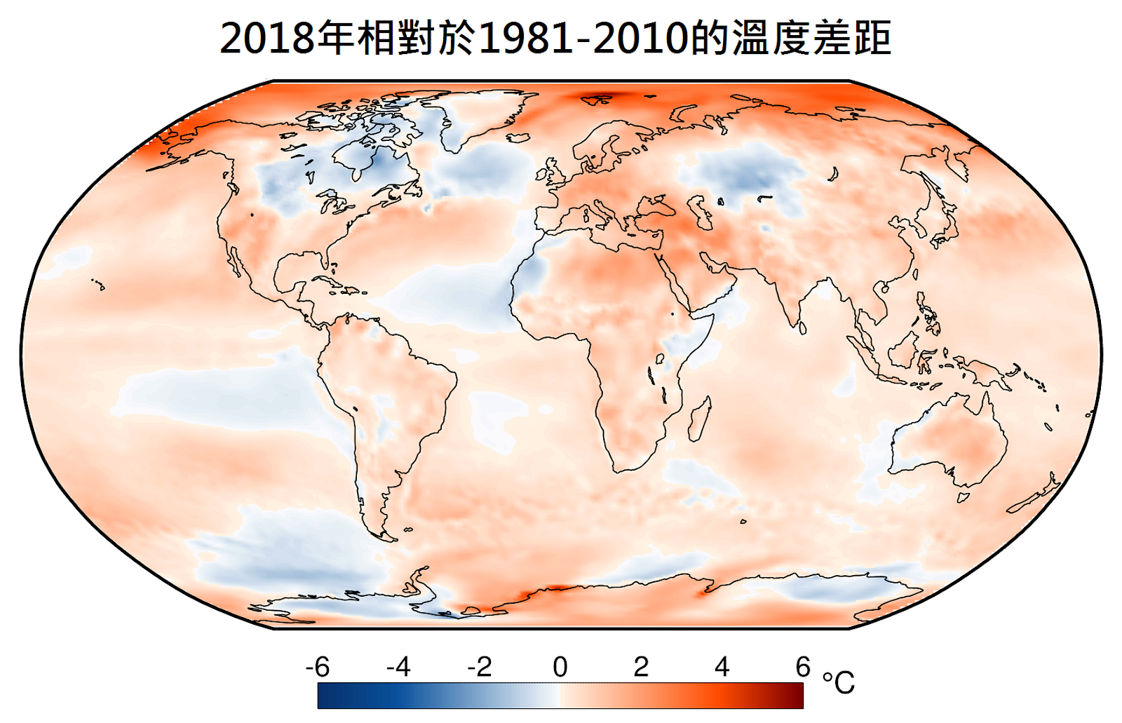 氣候暖化不是全球平均分布的,由於大尺度天氣系統的熱量輸送作用,南北兩極暖得比全球平均快一倍或以上(註2),這個現象2018年在北極圏內頗為顯著(圖2)。
