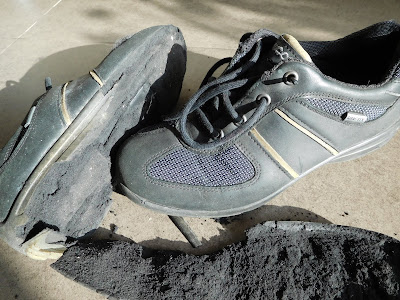 不過上次爆鞋尚可見到鞋的內部有一定的結構,為行山者腳底提供有力支撐,今次所見腳底沒有結構,只有性質不明的填塞物墊在腳下,薄薄的鞋底與這些填塞物黏貼,這些黏貼物粉碎之後,鞋邊受力不堪負荷就爆了,於是「甩底」和黑屑散落一地。
