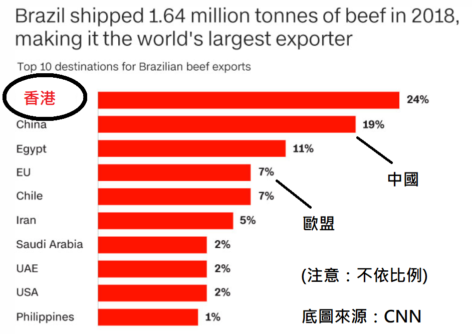 總括地說,香港人食巴西牛肉佔該國出口約十分之一或以上,因出口導向的畜牧業引致的亞馬遜熱帶雨林損耗(包括大火),其中十分之一責任要算到香港頭上,不能逃避,從人均食用量看,香港人的「巴西牛肉食量」更是鶴立雞群。