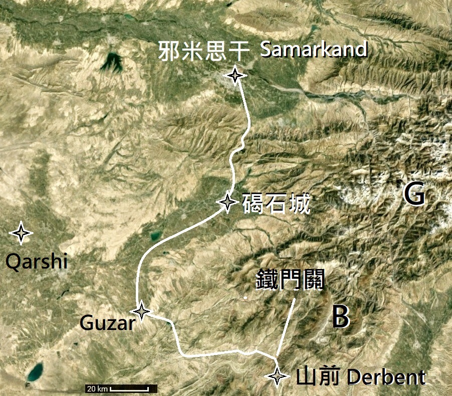 邪米思干和碣石都是荒漠地區中的綠洲(注意:俄國佔領時期大興土木建灌溉系統,衛星圖片顯示的綠色範圍遠比丘處機經過時大)。至於「鐵門」,十九世紀西方資料稱位於Karchi和Derbent之間(註6),Karchi即今Qarshi,Qarshi和Derbent之間隔着中亞主要山脈Gissar山脈的餘脈Baysun-Tau山脈,在這條路線上,今Guzar位於山脈西北,Derbent位於其東南,據此定Guzar為入山位置,定Derbent為「山前」,而Derbent以北剛好是山脈一個缺口,方便行旅。擬定穿越山脈的路線主要考慮丘處機乘坐馬車,盡量走在坡度較緩的河谷,如要翻山則選海拔較低之處,反覆觀察立體衛星圖像後,擬定全程路線見圖1。