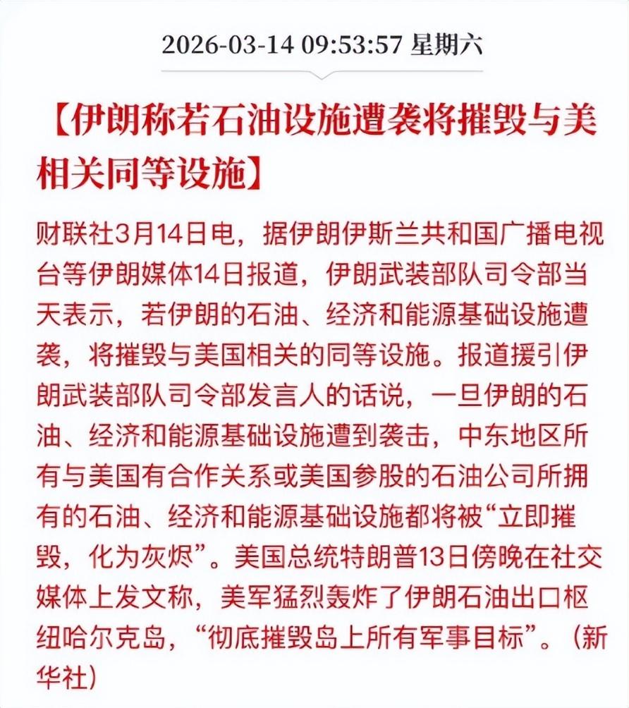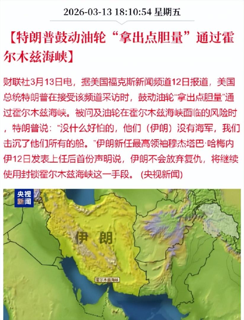 说实话,美军自己的航母都已经退到距离伊朗1000公里以外了,最近的军舰距离伊朗都有700公里。 霍尔木兹海峡上的船距离伊朗仅几十公里远,陆地上的重炮都轰的到,美国海军拿什么去保障油轮安全。 只要美国不派遣陆军打进伊朗,那就绝无可能保障霍尔木兹海峡的通行安全。 美国发动战争的初始战略意图是颠覆伊朗政权,但从目前的结果来看美国的这个战略意图已经彻底失败。 在美国动手前,伊朗的神权政府已经摇摇欲坠,国内意见混乱,多处暴动。 但在美国动手后,伊朗国内反而统一了意见,主和派瞬间消失,并联手推选了小哈梅内伊上台。 特朗普忙活半天,把伊朗的最高领袖从哈梅内伊换成了哈梅内伊,还神奇的让哈梅内伊年轻了30岁,变回了年富力强的壮年。 都说特朗普没被子弹打死是上帝的旨意,但如今小哈梅内伊没被导弹炸死那也可以说是安拉的旨意。 而且根据圣经和古兰经,这两位其实是同一个神,上帝就是安拉,安拉就是上帝。 都是神选之人,现在就看神给哪边的旨意更牛逼了。 现在中东地区的储油罐已经快满了,马上油井就要被迫停产了。 油井这东西可不是一个水龙头,说开就开说关就关,要停产就需要封堵油井,向里面灌注水泥塞等。 而复产的时候需要通井、刮管,清除井筒内的沉积物、锈垢,重新射孔、酸化解堵,这样才能恢复地层渗流能力,然后进入试产流程,反复调试后才能正式稳定生产。 光这个复产的过程,就高达1~2个月,地质复杂的油井甚至需要更久。。。 美国完全没考虑过如果目前的情况持续几个月之久该怎么办,就好像当年美国发动关税战的时候没想过中国真敢反击一样。 没有石油,想提升能源供应,那就只能买光伏设备或风力水力发电设备,买新能源汽车等等,可这些东西全在中国手里。 而且伊朗自从小哈梅内伊上台之后,政治智慧突然飙升,并不打算自己蛮干,开始拉盟友了,公开表示愿意以人民币结算的油轮可以通行霍尔木兹海峡。