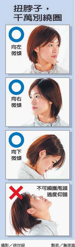 對於有人以頸部繞圓圈的方式,或習慣讓脖子歪一側,甚至發出「喀」一聲,他認為,這都是不健康的方式。