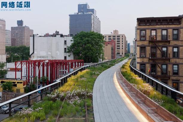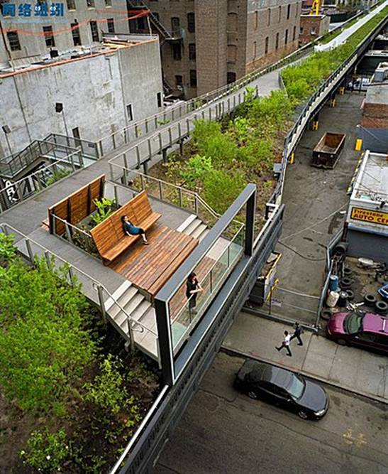 修建在鐵軌上,鋪上隔水布,填上土,種上植物,裝上長椅路燈和欄杆,變身成為步道花園。不僅合理改造了原本廢棄的空間,而且利用從周圍建築屋頂上收集的雨水進行灌溉。澆築的混泥土也能長久使用,做到最大程度的節能環保。