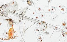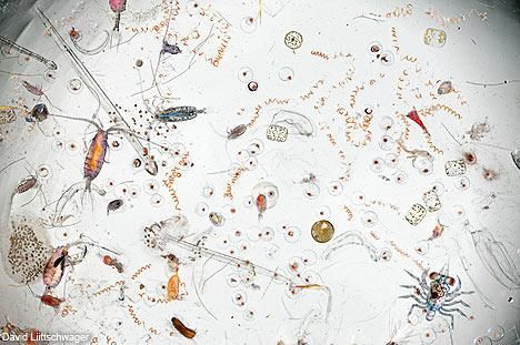 這是一滴海水被放大25倍的畫面。"浮游生物"這個詞不是描述一種特殊的有機體,是以其大小和生命體太小無法遊過大洋流的事實而定義的。浮游生物包括水體病毒、只有在顯微鏡下才能看得到的海藻和水中細菌、小蟲子、甲殼綱動物,還有魚卵、大動物的幼體和植物 (如海草),以及螃蟹、龍蝦、魚和海膽。因隨波逐流,大水母也被歸類為浮游生物。