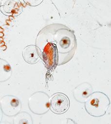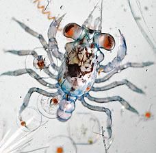 1. 螃蟹幼體:長不到四分之一英寸,這些脆弱透明的節肢動物離"成熟"還很遠,但是它的各部分節肢已經依稀可辨。尖利的小爪子以及一對生動的大眼睛已經清晰可見,多面複合晶體也能看得到。