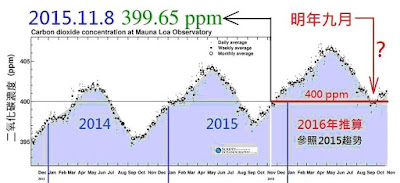 十月,夏威夷Mauna Loa觀象台(註1)的平均二氧化碳濃度是398.29 ppm,進入十一月後季節性回升,11月8日至14日的一星期平均讀數是 400.43 ppm.,超過了400 ppm 心理關口。