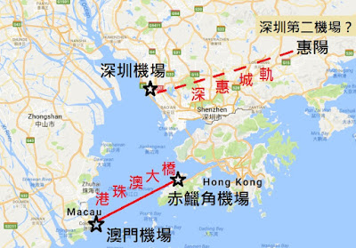 地圖清楚顯示,赤鱲角機場和澳門的距離,比深圳機場和惠陽的距離短,而且港珠澳大橋即將落成,據稱通過大橋車程僅需二十分鐘,來往兩個機場十分方便,轉機不會比倫敦希斯路機場轉機花更多時間。