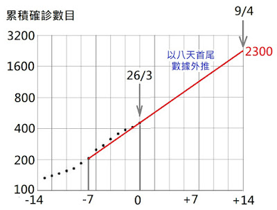 ﹙原文發表於2020年3月26日)今天(3月26日)政府簡報會表示新增確診43宗,累積總數453宗,這個單日升幅打斷了連續幾天的下降趨勢,非常可惜,也把外推線推高,兩星期後(4月9日)得出數字2300宗,比前兩天的外推數字多200宗。