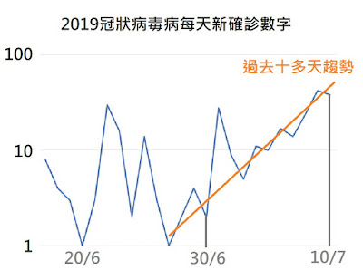 冠狀病毒病似乎捲土重來,為了方便大家比較量化地感應情況,畫了一個每天新增確診數字圖供參考,注意左面垂宜軸不是 1,2, 3, 4 ... 一步一步增加,而是1, 10, 100 ... ,以十倍級別增加,