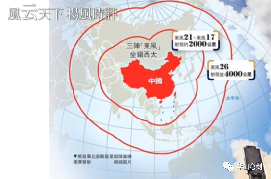 我们再看一下这张图,这张图我们要深切记得,这是中国的东风-21D、东风-17以及东风-26弹道导弹的射程范围。