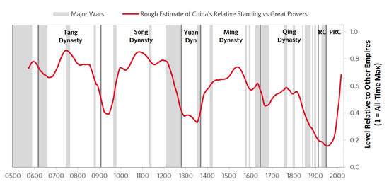 在下面的圖表中,我繪製了一張公元600年至今中國的力量比較圖。它傳達了在這段時間內中國相對於世界其他帝國的強大力量。儘管該國各地還有其他朝代以及其他各種勢力的存在,但我沒有在這張圖表中顯示它們,因為那樣會產生太多細節,以至於無法展現真正的大局。如您所見,在大部分時間裡,中國都是世界上最強大的帝國之一,除了1840年左右到1950年左右急劇下降之外,還有一個明顯的例外。如圖所示,大約在1950年,它開始重新崛起,起初緩慢然後非常迅速,重新獲得了其作為世界上兩個最強大帝國之一的地位。 ![]() 在過去的1400多年的大部分時間裡,大多數朝代都非常強大,文明且繁榮。唐朝以後,中國擴大了疆界,並經歷了文化的繁榮。在南北朝時期(從900年代到1200年代),中國是世界上最具創新和活力的經濟體。在明朝(1300到1600年代),中國是一個強大的大國,享有一段既富裕又和平的美好時期。在清朝初期(1600到1700年代),中國擁有最大的領土擴張範圍,統治著世界三分之一的人口,同時擁有極其強大的經濟實力。然後在1800年代初期到1900年代上半年,中國實力衰落,而歐洲國家(尤其是大英帝國)實力增強。從1800年左右到最近,亞洲的財富和權力逐步轉移到了歐洲,這是世界歷史上最大一次的財富和權力轉移,主要是由於中國的衰弱,這種權力和財富的轉移應該認為這是一種反常現象,而不是常態。這種演變和這段歷史所提供的教訓在中國人的心中非常重要,對我而言尤其有趣。 在上圖中,週期性的起伏是值得關注的。其中的原因我在描述大循環週期的時候解釋過,源於週期性力量的獲取與衰弱和短板的暴露和修補(我將在本書的第2部分中為您詳細介紹這些朝代的興衰,其中將更深入地介紹本書所涵蓋的主要帝國和朝代的主要周期)。請注意,這些朝代大周期通常持續約300年。在每個階段中,都有不同的發展階段以及皇帝為使王朝從一個階段進入另一個階段所做的工作,以及挫折和衰落的原因。換句話說,這些歷史中蘊藏著許多教訓。這就是為什麼中國人學習歷史以汲取經驗教訓,以幫助他們計劃未來並處理眼前的事件。相信我,從這些歷史中汲取的教訓現在正在指導中國的決策。對我來說特別有趣的是,看到原型大循環的歷史可以追溯到更遠的歷史,並進行瞭如此詳細的描述,因為中國的連續歷史是如此古老,而且文獻記載如此豐富。有趣的是,從17世紀到19世紀,東西方世界相遇並互動時發生了什麼?隨著自那時以來世界變得越來越小,相互聯繫越來越緊密,中國和西方大循環如何受到影響?彼此之間的聯繫使它們成為這兩個地區乃至整個世界的最大影響力之一。 在自習研究不同國家幾百年的歷史,並初步了解他們幾千年更久遠的歷史後,最重要的感受就是我看到的與我之前所認知的完非常不同。我發現這對於我觀念的改變類似於在Google地圖把視角拉高,這樣我可以看到之前從未見過的歷史輪廓。我還可以看到,同樣的故事由於基本相同的原因而反復出現,並且我學到了關於一些大事件如何發生以及更好應對的普世真理。除了影響我對事物的看法之外,我還了解到對歷史不間斷的研究如何極大地影響了中國人相對於美國人的思維方式。美國祇擁有大約300年曆史的國家(因為美國人認為他們的歷史始於來自歐洲的定居者),而且大多數美國人對歷史和歷史研究的興趣不大,我可以看到,美國人和中國人的想法截然不同。 例如,對美國人來說300年是很長的時間。對於中國人來說,這是最近的事。儘管一場革命或一場戰爭會顛覆我們的體系,這對美國人來說是難以想像的,但對中國人來說卻是不可避免的(因為中國人已經看到他們一直在發生,而中國人已經研究了他們為什麼會發生)。儘管大多數美國人關注特定事件,特別是現在正在發生的事件,但大多數中國人看到了隨著時間的推移而發生的變化,並根據它們的發生情況進行了分析。儘管美國人為目前的需求而戰,但大多數中國人都在製定如何在未來達到目標的戰略。由於這些不同的觀點,中國人通常比美國人更具有思想性和戰略性,而美國人則更加衝動和戰術。我還發現中國人比美國人更具哲學性(從字面上讀懂哲學)。如果您閱讀他們的著作和演講,您會發現這是真的。關於現實如何運作以及如何妥善處理現實的哲學融入了他們的思想,這些思想在他們的著作中得到了表達。