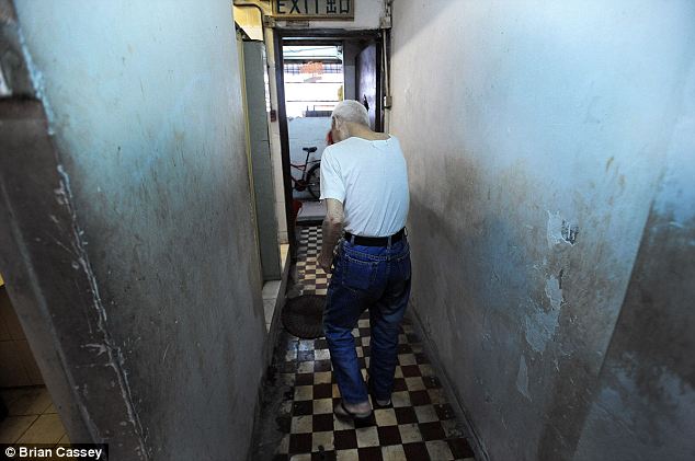 Tai Lun Po walks to the bathroom which he shares with the other residents