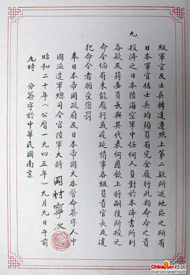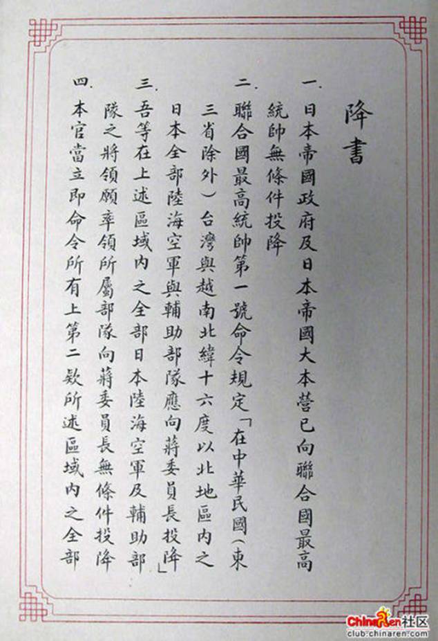 六十多年過去了,有幾個中國人知道日軍投降書是什麼樣子。為什麼G.C.party(共產黨)只宣傳9.18日軍侵華而不宣傳8.15日軍投降,不讓國民看看日軍投降書?難道僅僅是 因為文中多次出現:日本陸海空軍及其輔助部隊向蔣委員長投降。或者是因為受降落款是:中國戰區最高統帥特級上將蔣中正特派代表陸軍一級上將何應欽。